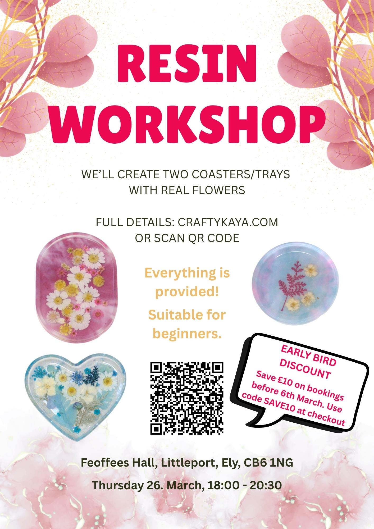 Investment: All-inclusive! We provide the resin, various mould shapes, flowers, gold leaf, and all safety gear.